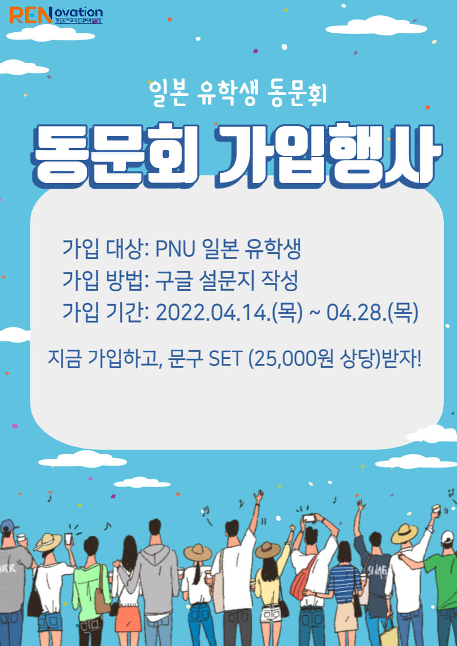 Event Home News & Events Event 일본 유학생 동문회 신규 가입 이벤트 Writerpnu_alumni Date22.04.14 Hits3735 가입 링크: https://forms.gle/hg6srZG8uevM62w49 List Prev2021 하계방학 동문회 문화체험 지출 관련 안내사항 Next외국인 유학생 졸업자 취업현황 수요조사 시행 Survey of Employment status for int'l students graduates(4/5~6/30)