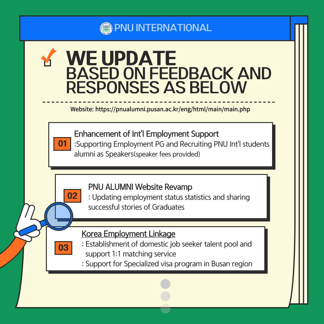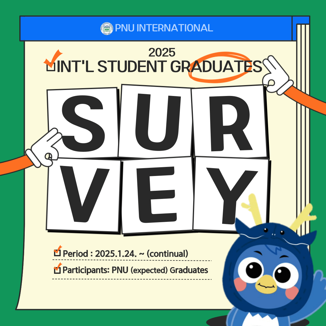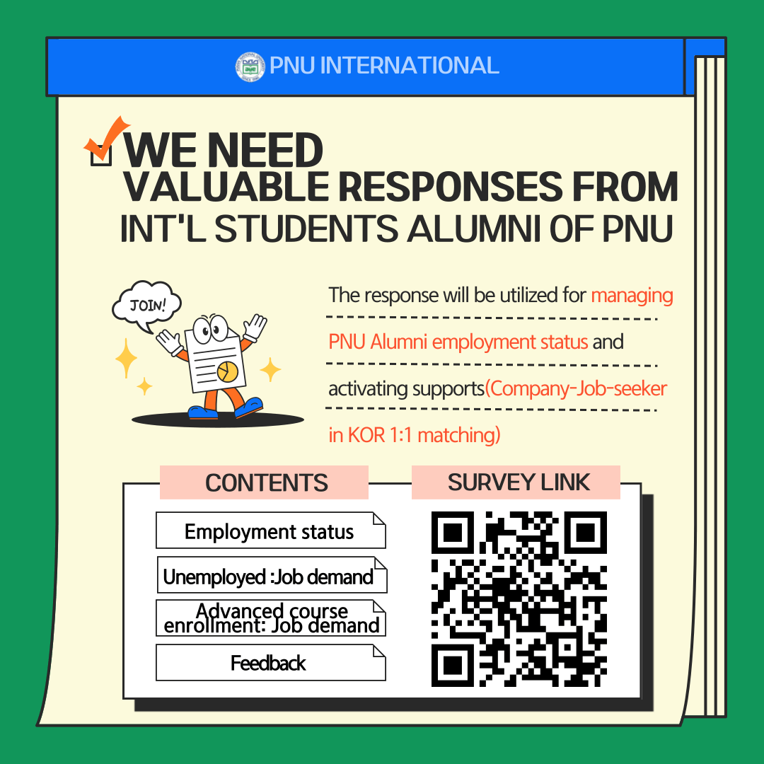 News Home News & Events News 2025 PNU (Expected) Graduates Employment Statistics Survey Writerpnu_alumni Date25.02.04 Hits2167 ☞설문링크 바로가기(Survey Link): https://forms.office.com/r/b3DE0xPdnh List Prev2025 PNU 졸업(예정)자 취업현황 수요조사 Next[Myanmar Alumni] Emergency Fundraising for Myanmar Earthquake